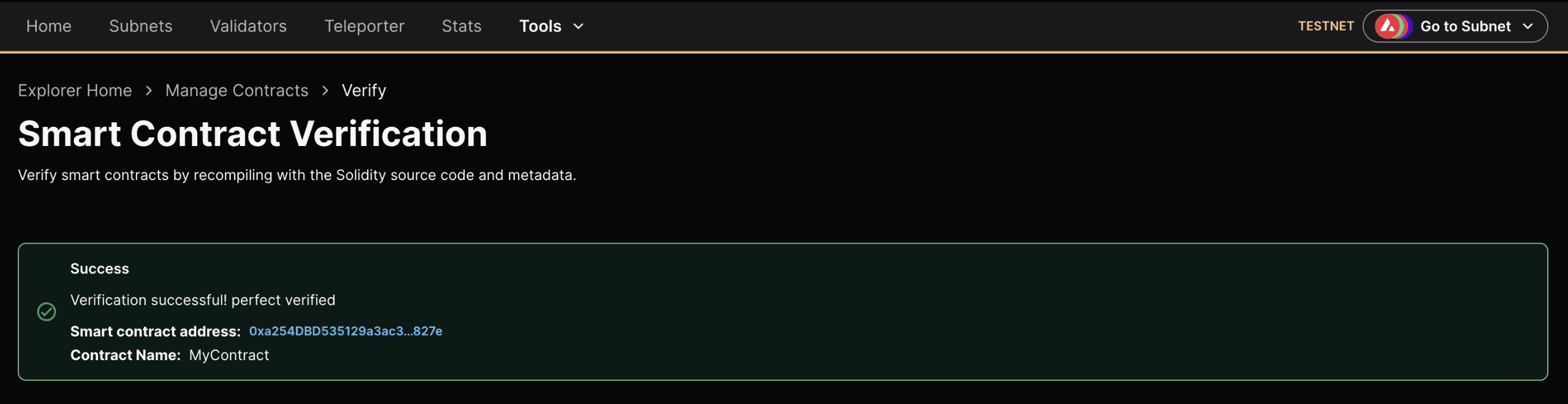 - Navigate to the official Avalanche Explorer and click on Tools dropdown menu to select Smart Contract Verification interface. You may need to open the Testnet Explorer in case the contract is deployed on Fuji Testnet.
